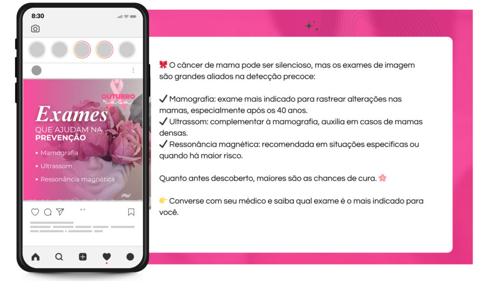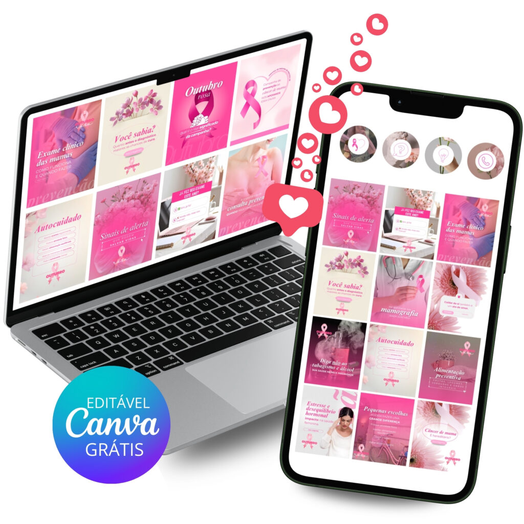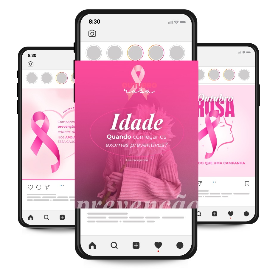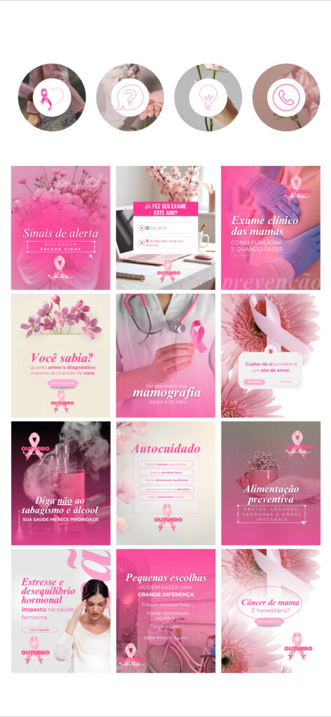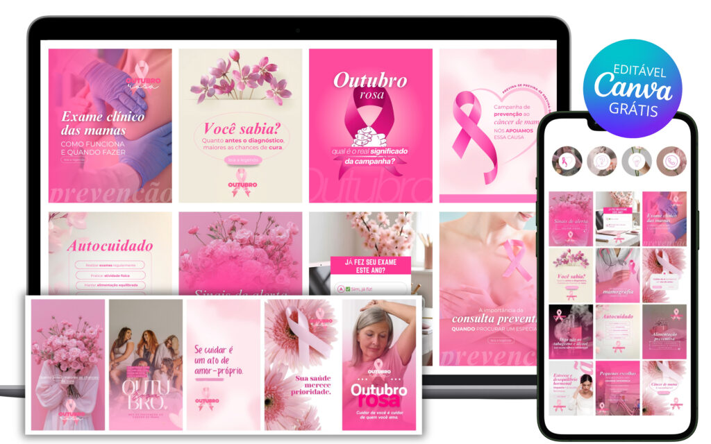 Com o Pack Outubro Rosa, você terá 30 posts prontos (artes + legendas) para usar no seu Instagram, mostrando profissionalismo, acolhimento e compromisso com a prevenção do câncer de mama